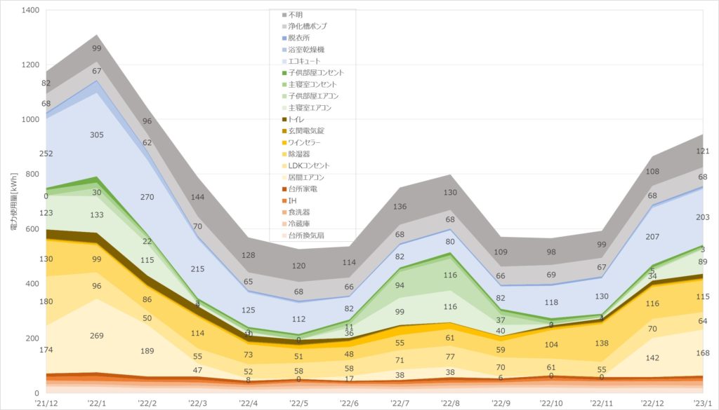 使途不明が多くて申し訳ないのですが、以下グラフが詳細です。やはりエアコンと給湯機が全体を占める割合が多いですね。また、子供部屋や寝室が多いのは加湿器が原因ですね。スチームタイプを使用しているので、電気代が高くつきます。そのあたりに節約ポイントがあるかもしれませんね。